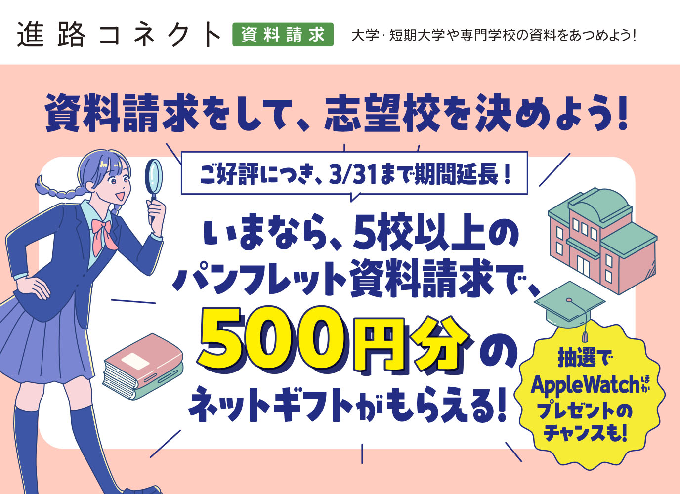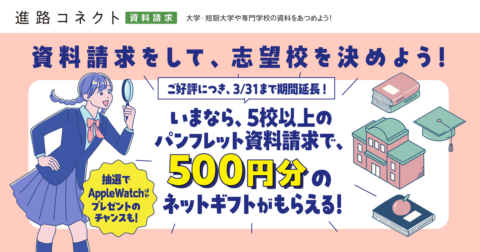 資料請求を5校以上申し込んだ方へ500円分の図書カードネットギフトをプレゼントいたします。